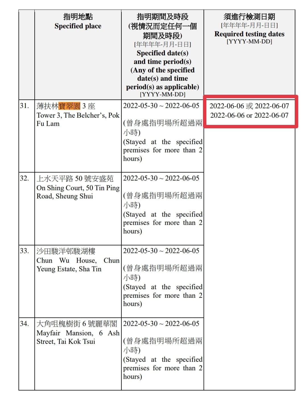 6月6日 0020hrs – 根據衛生防護中心昨天(6月5日)發出的最新強制檢測公告, 本苑第三座居民及曾於 5月30日至6月5日期間在上述地址逗留超過兩小時人仕,必須於 6月7日前到附近社區檢測中心完成強制檢測。 詳情可留意民政事務處及管理處稍後通告。此外,現時除第三座外,第六座曾有確診紀錄仍然上榜。