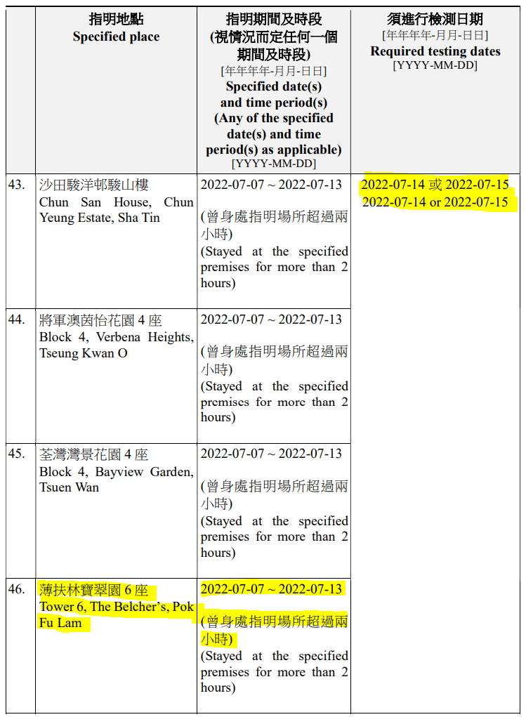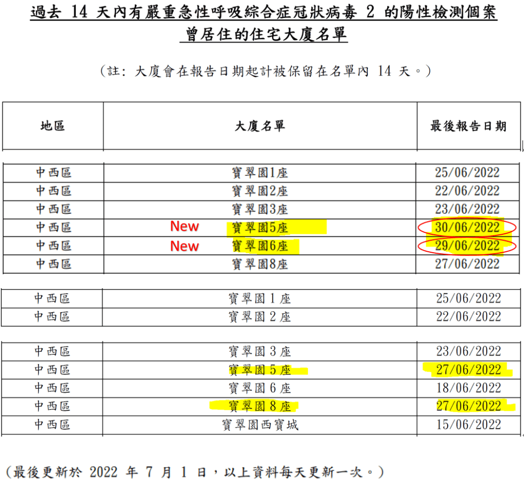 7月1日 2300hrs – 衛生署今天發出有關冠狀病毒陽性檢測個案確診大廈名單 (第五及六座有新確診個案)
