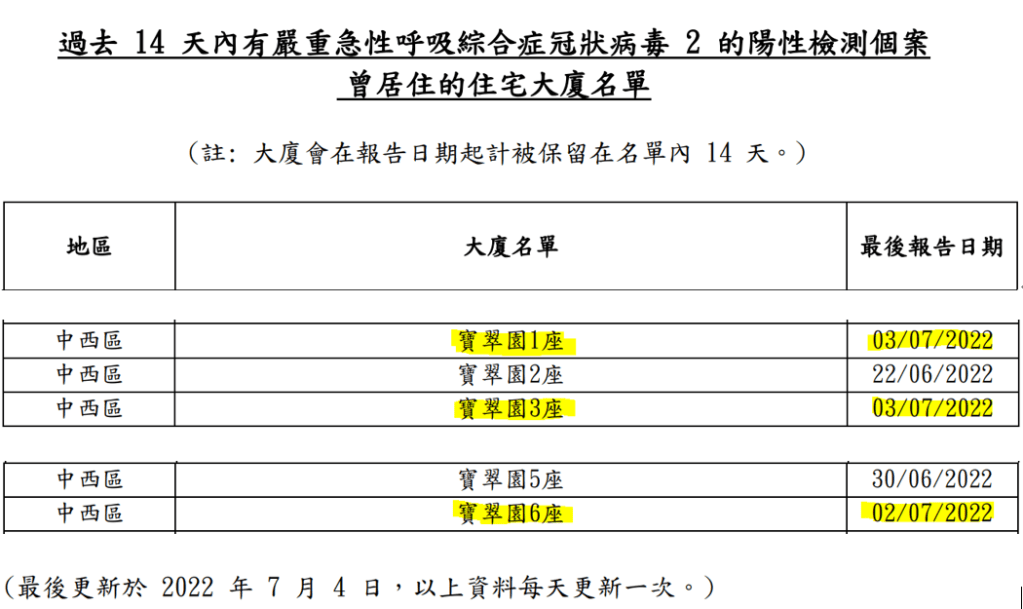 7月4日 2200hrs – 衛生署今天發出有關冠狀病毒陽性檢測個案確診大廈名單 (第1, 3及6座有新確診個案)