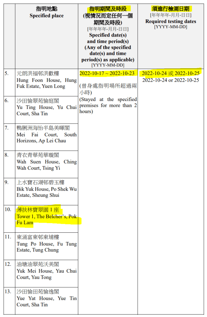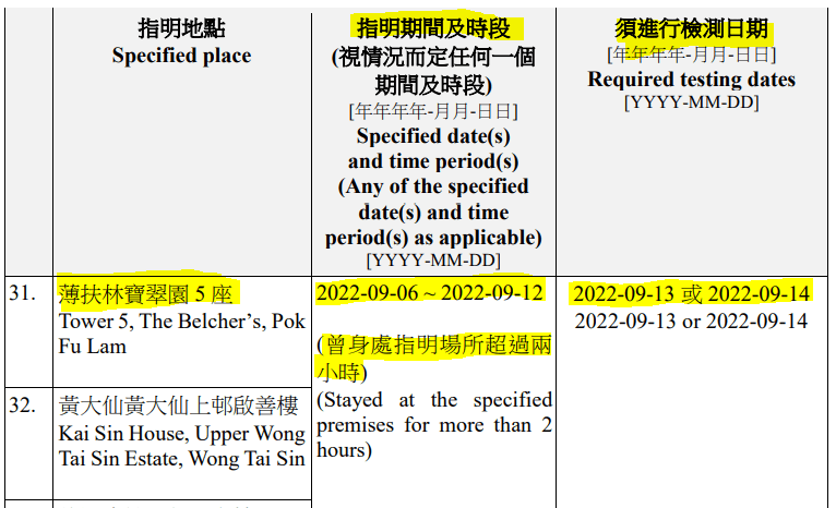本苑所有第五座居民及曾於 9月23日至9月29日期間在上述地址逗留超過兩小時人仕,必須於10月1日前到附近社區檢測中心完成強制檢測。 違例又未有遵守檢測令者會被檢控及罰款一萬!詳情可留意民政事務處及管理處稍後通告。