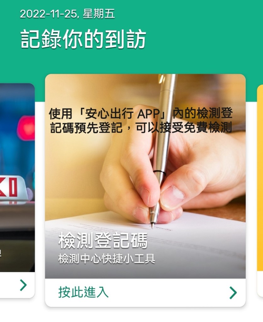 1. 在手機上使用「安心出行 APP」內的「檢測登記碼」預先登記好個人資料,再到預約系統預約(如右圖)