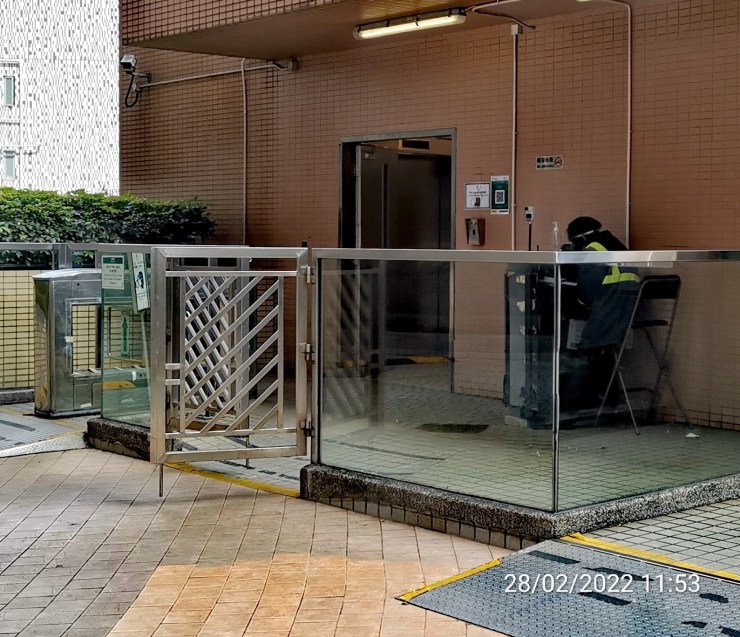 (圖:平台貨𨋢出入口削減至只有一名保安駐守,鐵閘長時間保持開啟,隨意讓閒雜人等不用量度體溫及登記進出本苑)