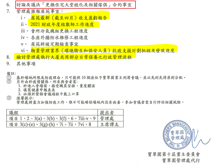 鑑於疫情漸趨穩定,闊別半年的業委會第五次會議將於下週一(5月30日)起恢復。當天議程豐富緊密,期間除訂出大會日期及時間外,會重點討論與眾業主息息相關的業主週年大會 (AGM) 議程包括: