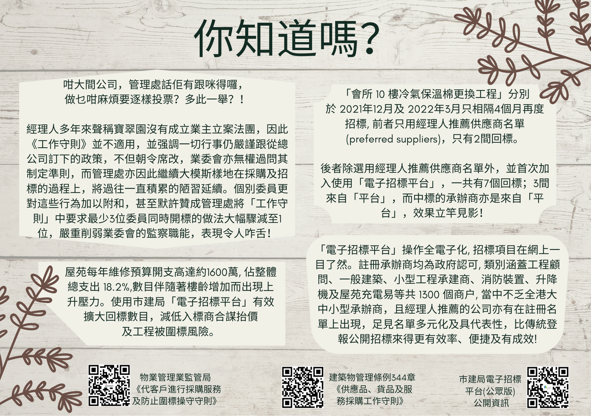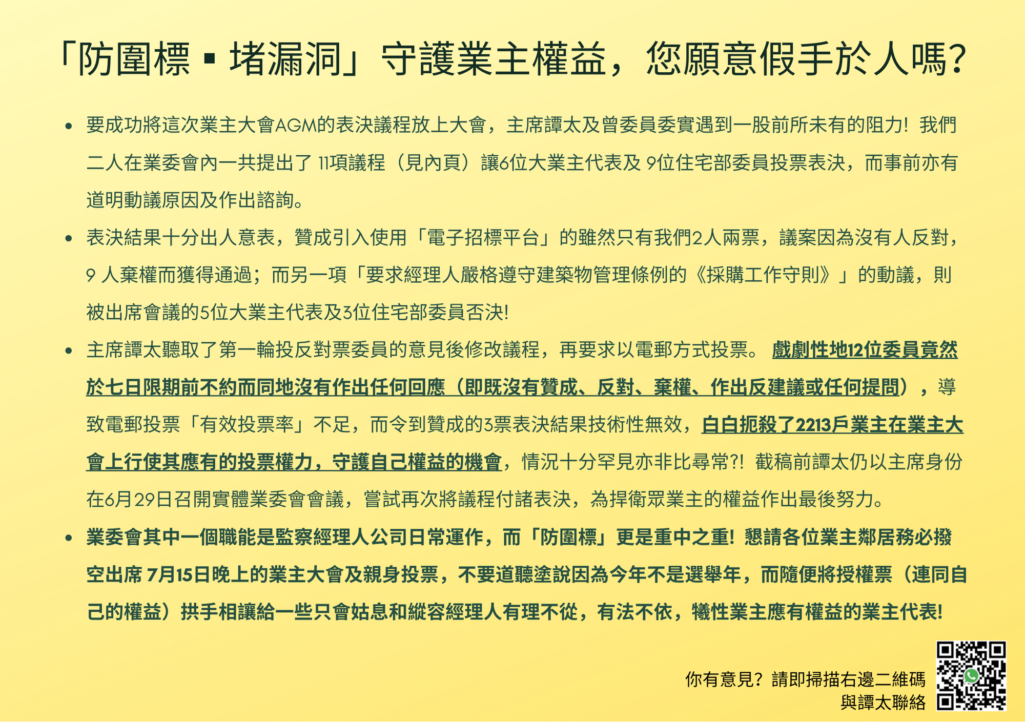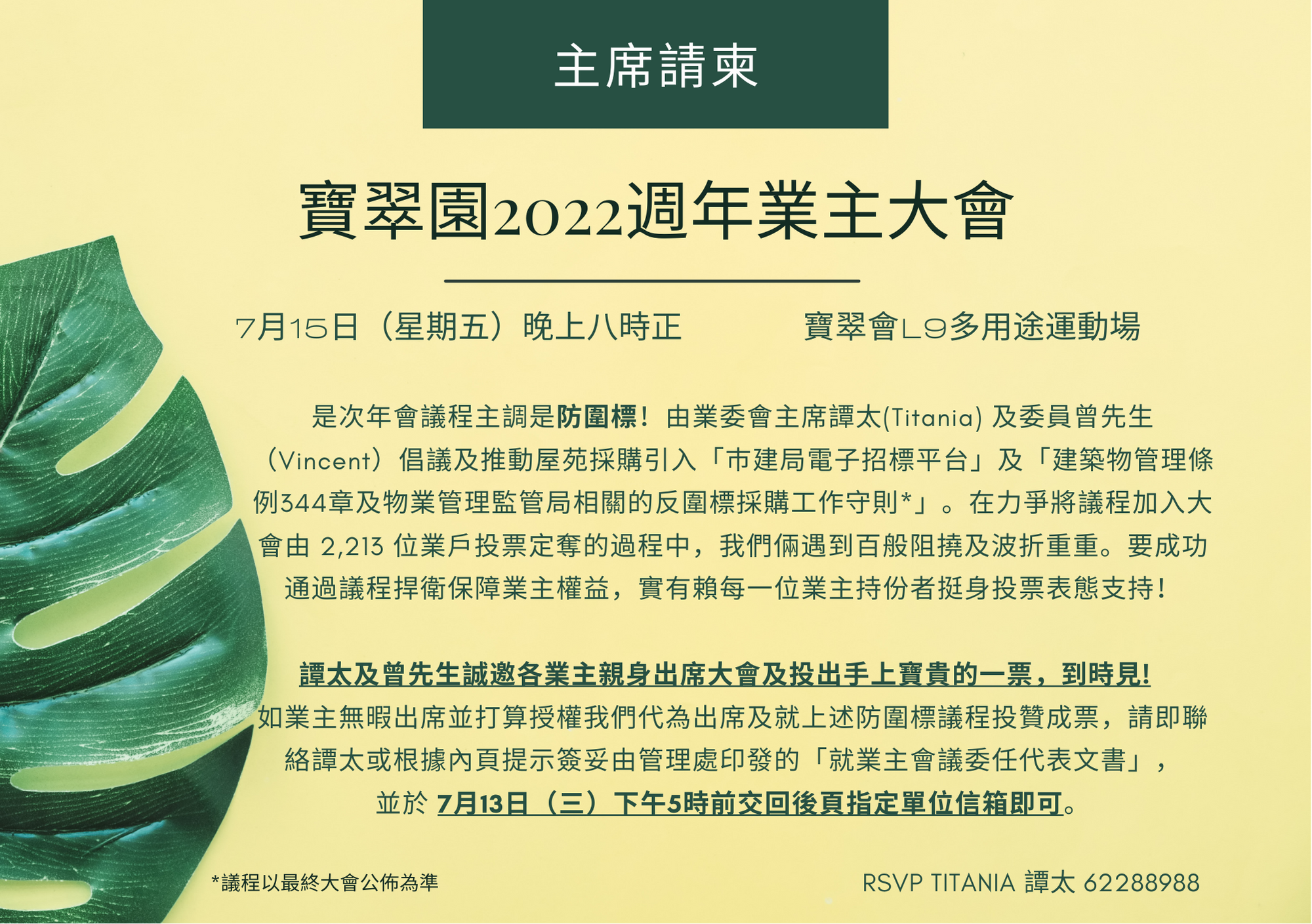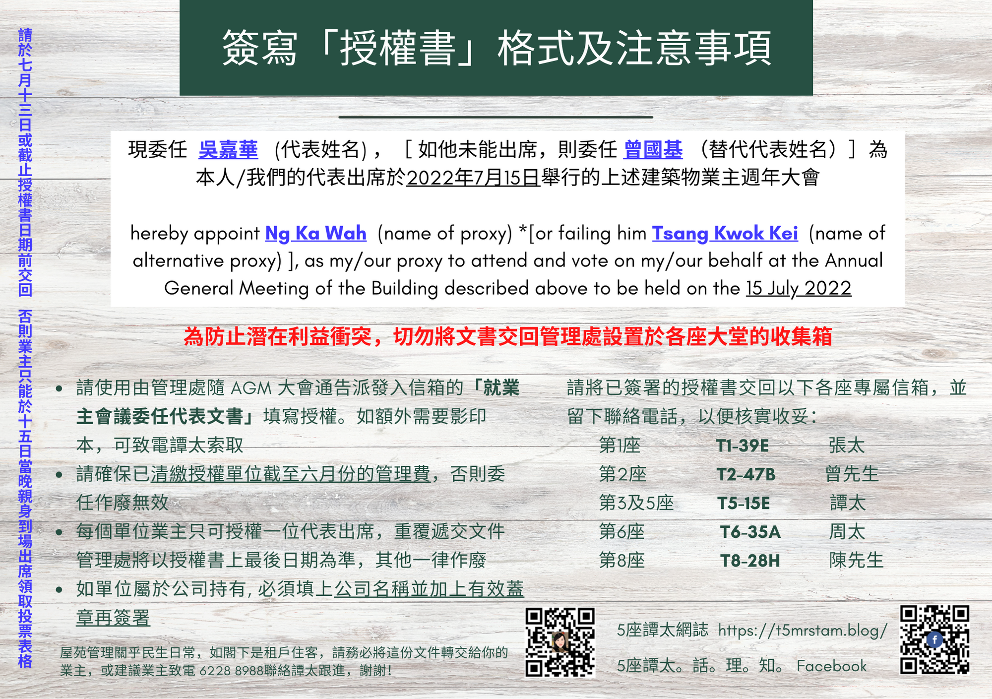 如大家身處海外而無暇出席,又贊成屋苑採購引入「電子招標平台」,可簽妥以下授權書以電郵,微信或WhatsApp 短訊方式於7月13日前回覆。請確保授權單位已清繳6月份的管理費。