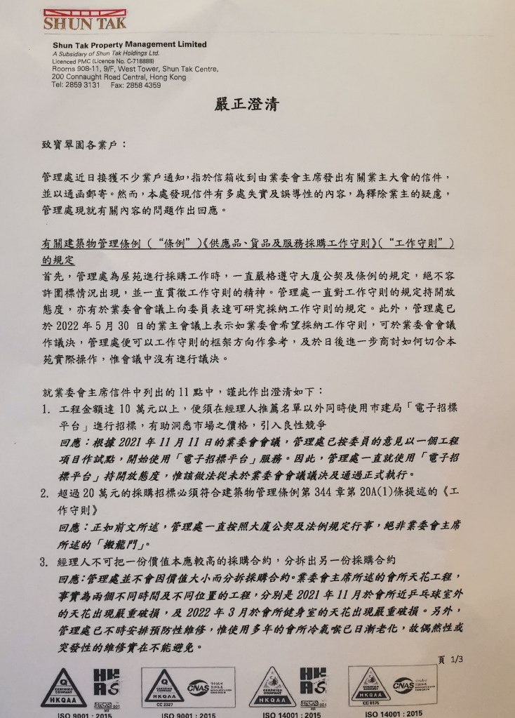 本人譚吳嘉華, 對於管理處於6月30日在沒有徵詢本人作為業委會主席的意見情況下,對今晚寶翠園7.15業主週年大會議程三「 工程採購引入使用電子招標平台」的內容擅自加插「純住宅部分支出」等字眼後, 公開張貼並派發住戶信箱,企圖左右議決結果而感到非常憤慨。