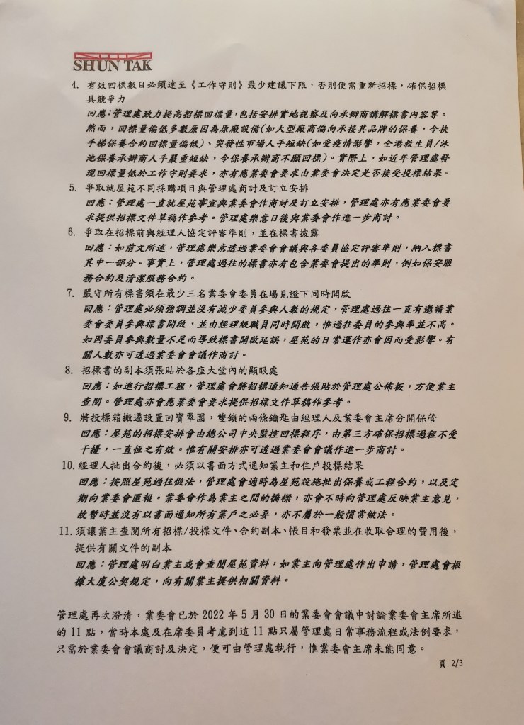 對於信德物業管理公司這次處理事件的曖昧態度及未有回應本人作為業主代表的申訴,我會正式去信「物業管理業監管局」作出投訴。
