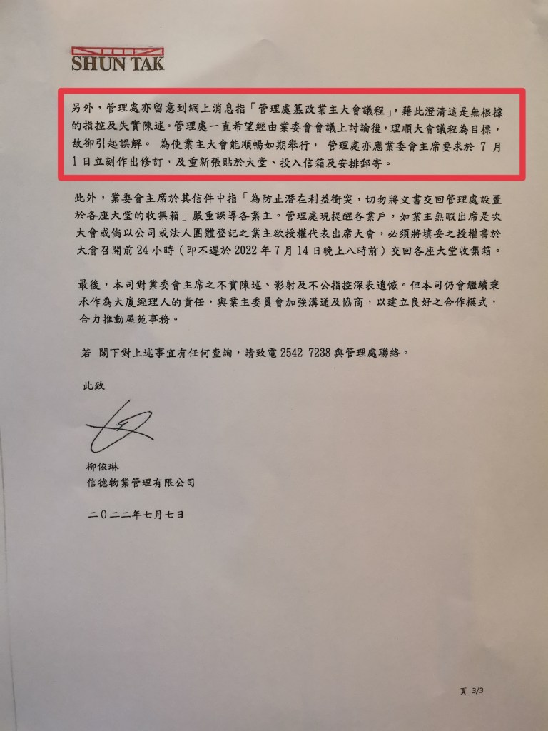 東窗事發及急忙更正後,管理處除托詞推說改動是本着「理順議程」,令到會議得以暢順進行外,一直並沒有按本人要求提交一個事故檢討報告;7月7日柳依琳經理更於各座大堂以信德物業管理公司名義張貼大字報公開信, 鄭重澄清指「管理處竄改議程一事是毫無根據及失實陳述」, 更以大篇幅試圖反駁本人以通函郵寄給各業戶之通訊,表現毫不專業及盡顯其一貫霸權本色。