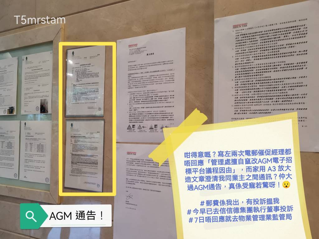 業主週年大會向來是一個嚴肅的場合讓眾業主可以聚首一堂,共同商討議決屋苑重要事務,其運作必須透明及符合大廈公契及建管條例要求。在此呼籲公契經理人信德物業管理有限公司, 必須以真誠及專業的態度服務全屋苑二仟多個業戶,我們居民才得以真正享受安居樂業的日子。