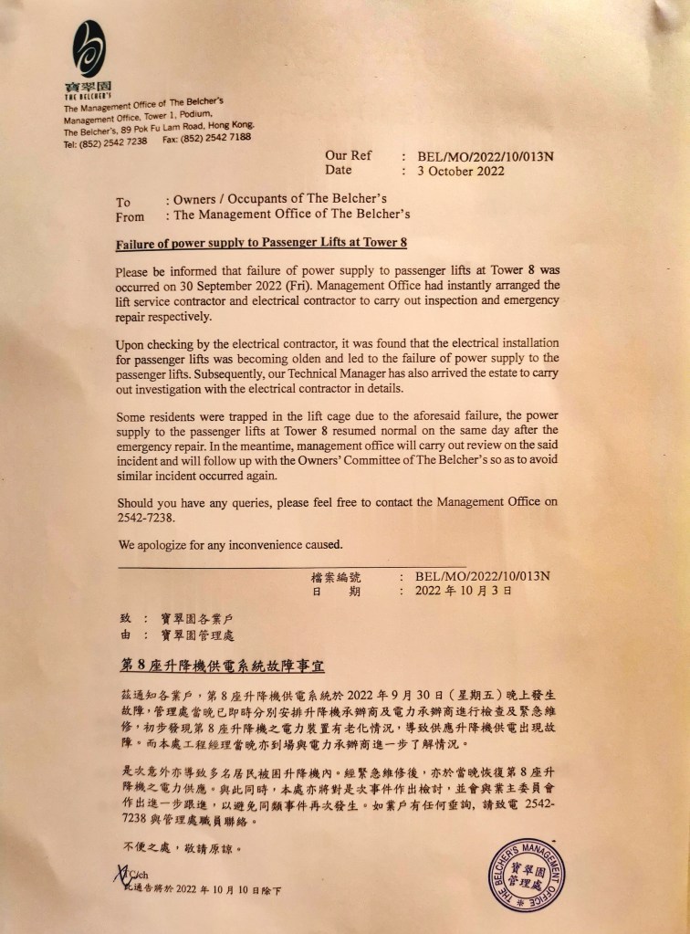 昨天(9月30日)晚飯後收到住戶通報由晚上約七時半開始,第八座6部高低層電梯同時因電力故障而突然停止服務,有住戶因此而被困在電梯內個多小時,管理處召喚消防處、電力裝置保養商「安樂」及電梯保養承辦商「富士達」到場解圍,直至晚上約9時將所有被困住戶救出,10時半才全面恢復供電,電梯服務續漸回復正常。