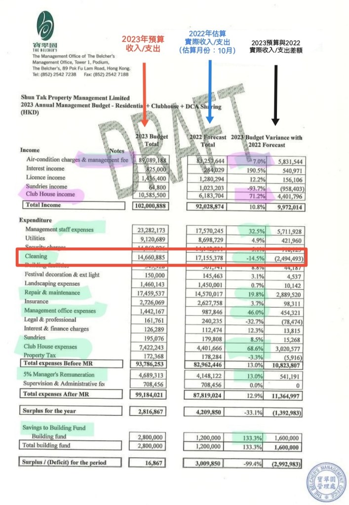 | 2023 初稿 | $15,252,929 (未包含外窗清潔服務費用預算 a 及管理處假設清潔合約來年加幅達18% b ) | 加回2022外窗清潔實際支出$323 萬(假設零加幅),2023年度總預算高達 $18,482,919 ! |