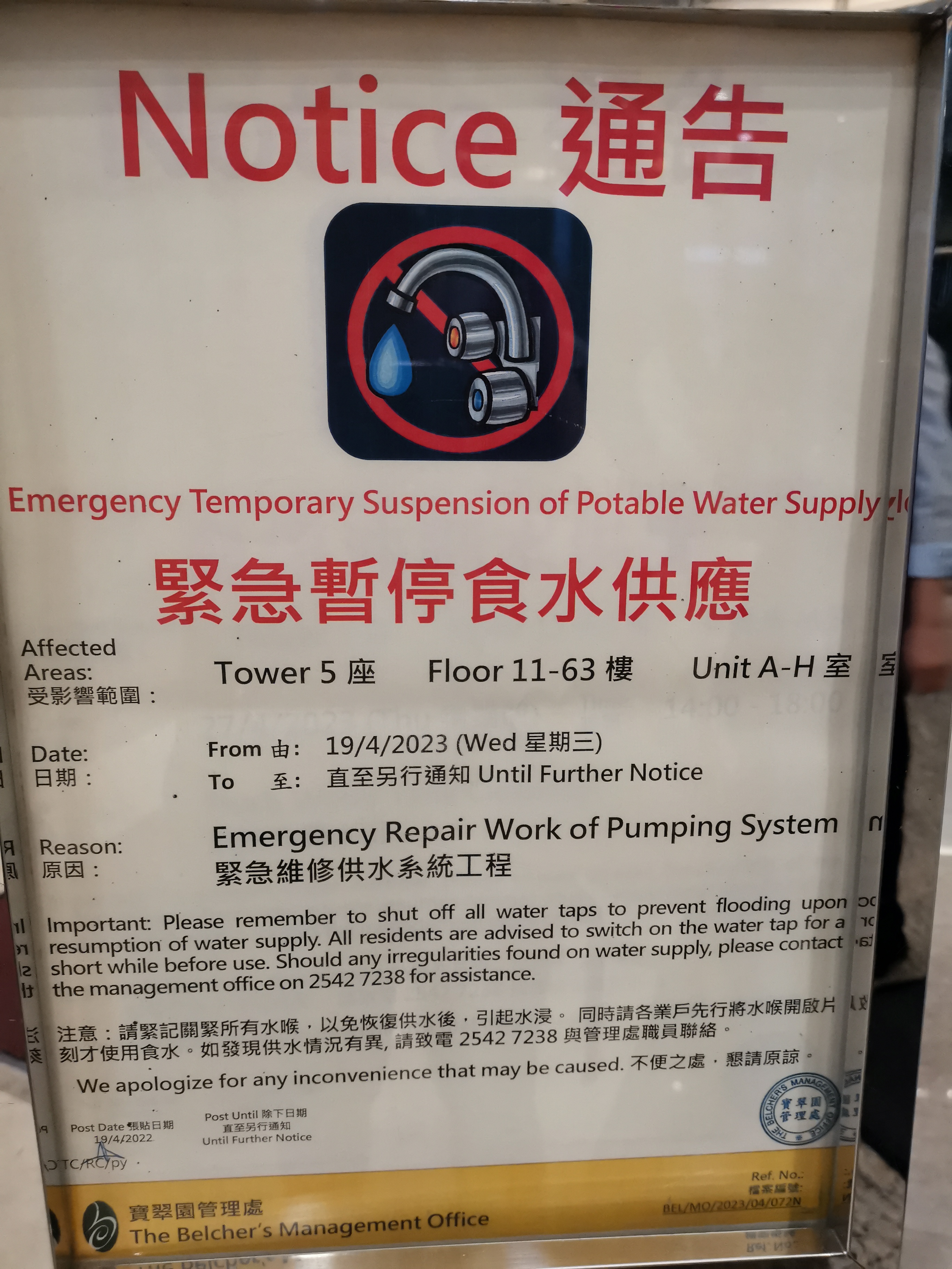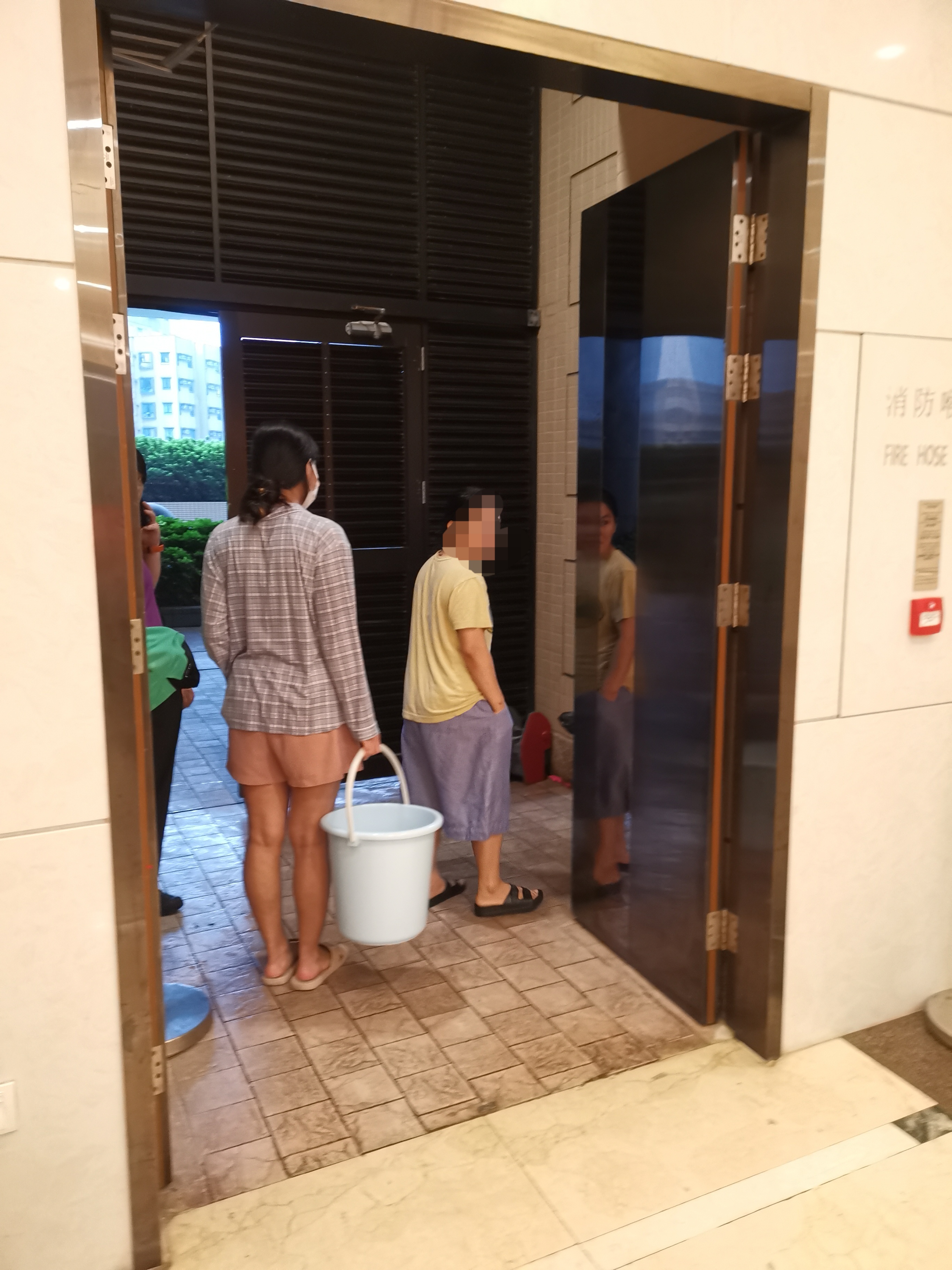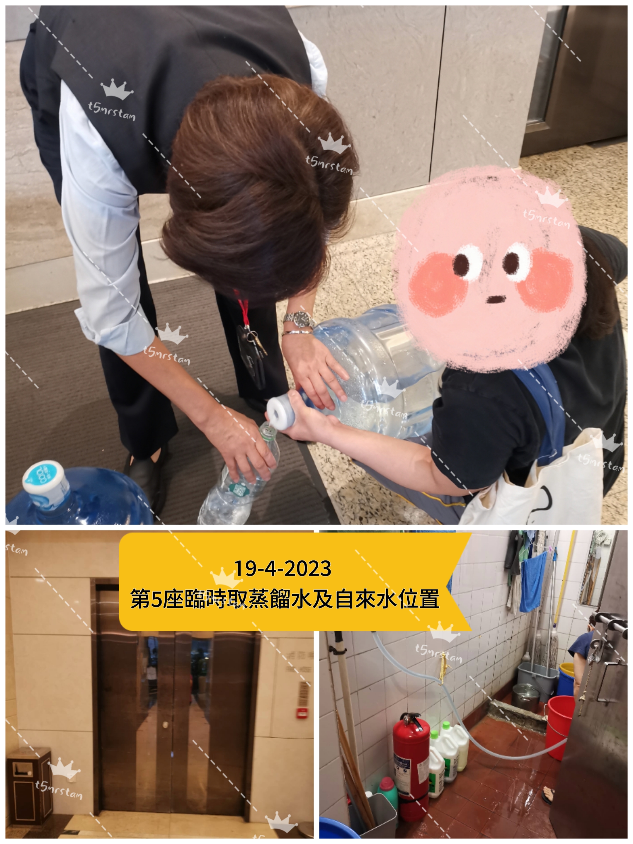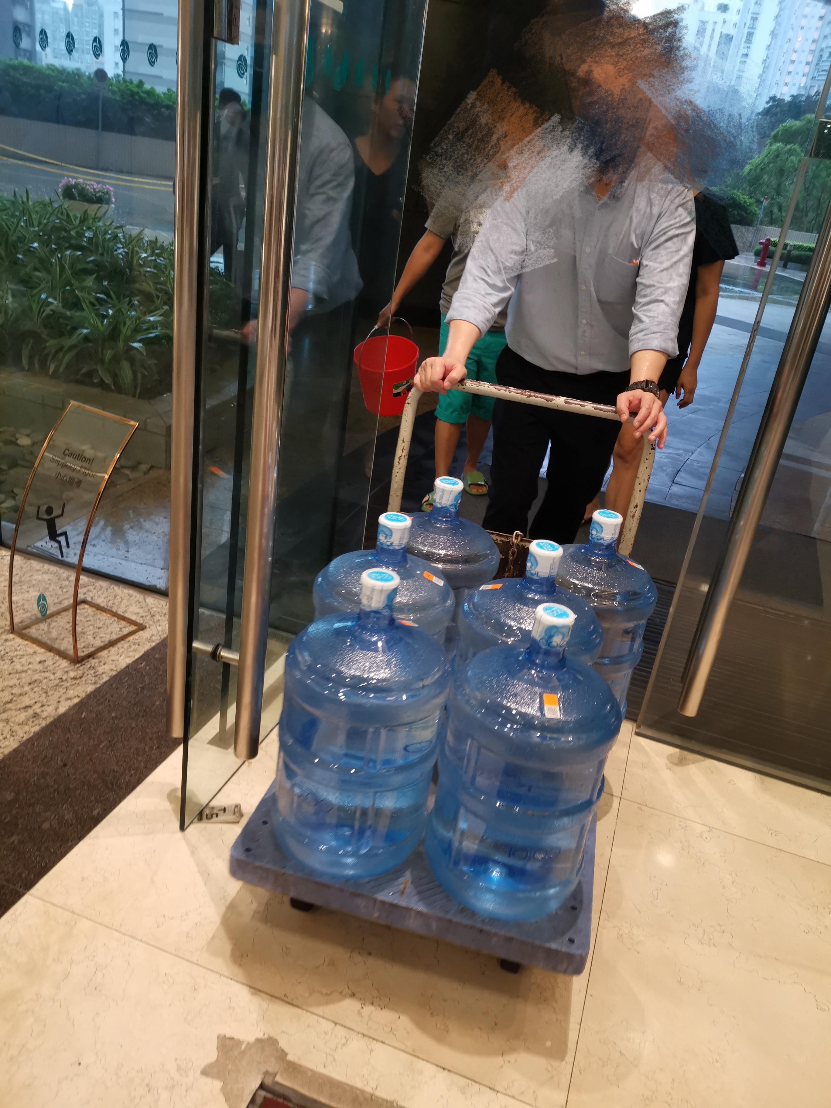 今年4月下旬港燈電力曾因供電系統設備故障造成港島區廣泛性停電48分鐘,影響到譚太所住第5座食水泵損壞,而後備水泵亦同告失靈,導致由翌日清晨開始便沒有食水供應。由於事出突然,一時間工程部亦需要時間安排承辦商搶修,譚太在知悉管理處在大堂安排了筒裝蒸餾水給住户取用後便率先到現場視察,發現大堂座頭竟如常只有一名客服駐守,除了應付日常工作,接聽來電查詢,且不時需要蹲下協助住户取水,忙得不可開交十分狼狽,地面又濕又滑,構成安全隱患。身為委員的譚太見狀便立刻聯絡陳經理要求增緩,未幾保安部、清潔部員工陸續到場協助運送食水上住户單位及拖抹大堂保持地面乾爽,經客服講解聚集大堂住戶陸續散去,而譚太在群組裏向5座住户發放最新臨時食水安排便功成身退。值得一提的是在知悉第5座緊急停水事故後,村經理及工程經理均沒有以正常渠道主動通知業委會,譚太也是早上醒來收不少同座鄰居查詢才知道食水出了狀況而需要即時跟進。