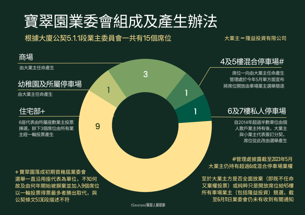 業主委員會由15人組成,以下一圖概括說明這15個席位之產生辦法: