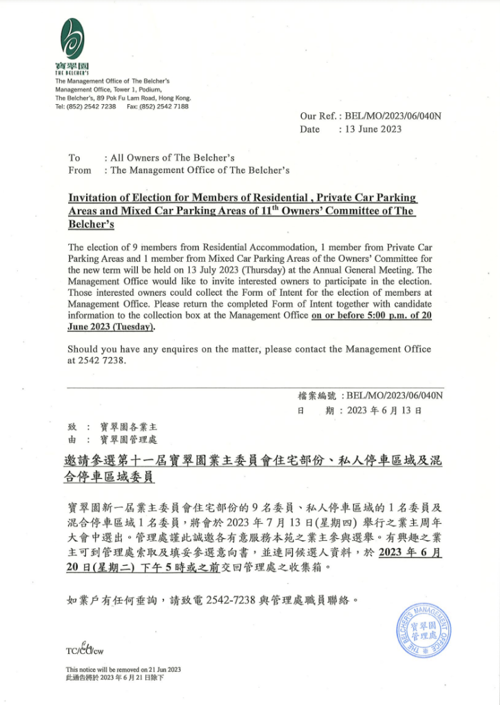 根據以上資訊,2023年7月13日第11屆業主週年大會中,2個混合及私人車場業主代表將會由選舉產生。唯觀察過去4年兩屆選舉,不知是什麼原因都未曾見有6及7樓私人停車場業主參與競逐,最終席位由大業主代表出任,缺乏車場小業主用家代表參與,實在遺憾。因此縱使今年有2個停車場席位可以開放公開競爭,最終能否打破傳統由車場小業主擔任,仍是未知之數,不容樂觀。
