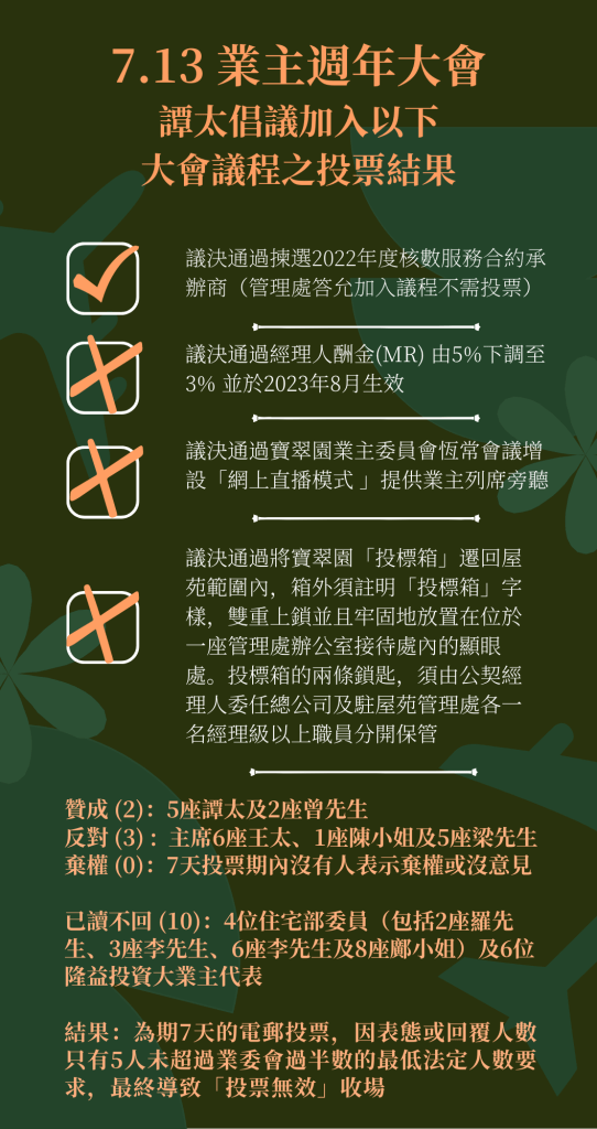 除首項建議揀選核數師因譚太提出管理處才勉強加入外,餘下3項需要委員投票定奪的項目只有5位住宅部委員表態,另外10位委員在7天電郵投票期內沒有任何回應,最終造成投票無效,無奈之下動議間接是被眾委員的表現及取態「否決」了。這亦意味着眾業主已失去對以上三項與屋苑民生及管治息息相關的表達意見及投票權利,譚太對此表示極度遺憾!