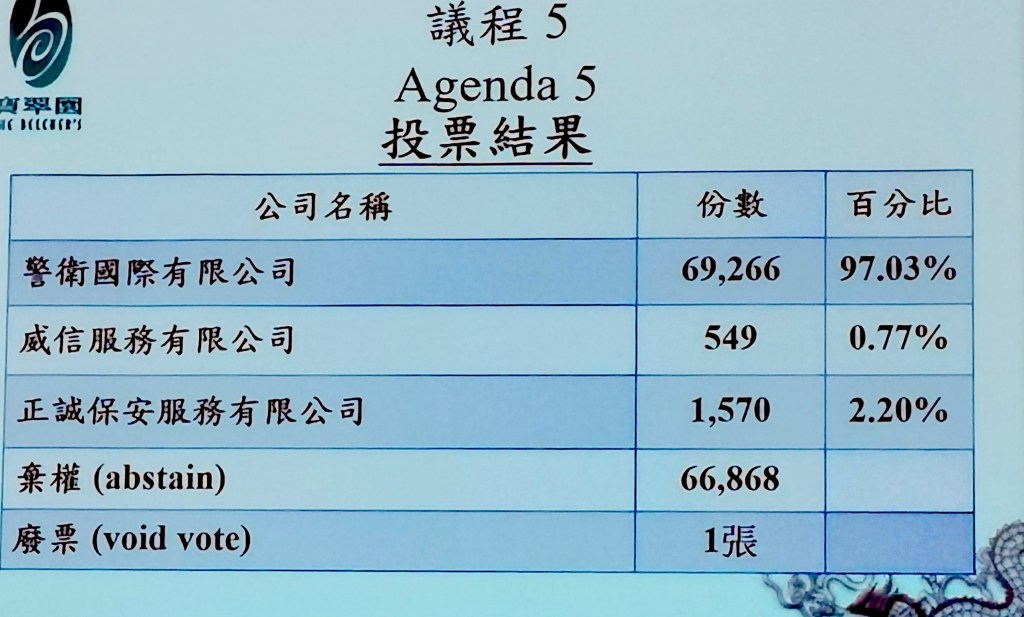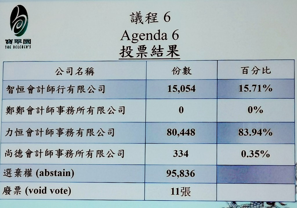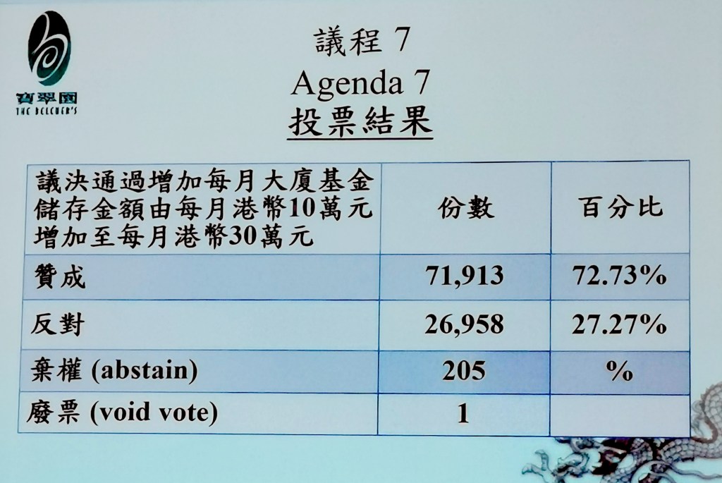 除了三項由管理處報告議程,其餘7項嘅議決事項都一一有序由業主投票揀選抉擇,期間在投票前台下出席業主有限時一分鐘的發言時間,反應十分踴躍。