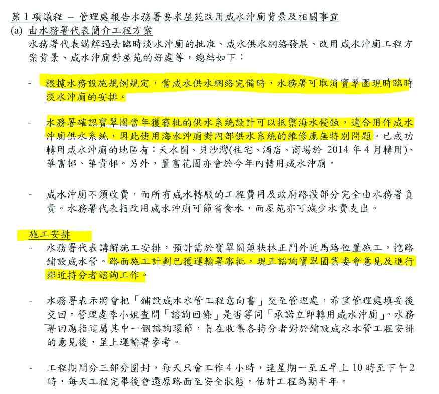 - 根據水務署會議紀錄,管理處代表(陸經理)喺早於2019年4月4日,即係張委員仲係第8屆委員嘅時候,已經代表寶翠園所有住宅、商場同停車場業主向水務署確認接受轉用咸水沖厠及由部門提出嘅施工方案(見圖三)。以張小姐嘅邏輯思維如果真的要追究業委會嘅責任,佢係咪好應該向自己問責先啱呢?