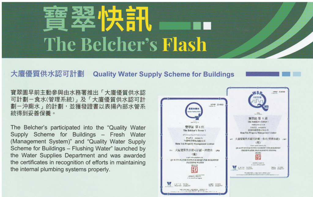 - 最後喺第10屆業委會要求推動下,管理處都參加左「 大廈優質供水認可計劃」,並於年初分別獲發優質「食水」及「沖厠水」證書。(見圖二)