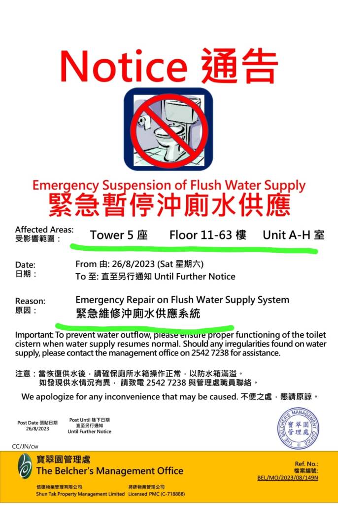 由於缺乏恆常保養,屋苑成個供水設施大大小小部件都因為陸陸續續老化而不段輪流壞,輪流整,輪流換,無限輪回!就好似上個禮拜📆係一、二座停;呢個星期📅就輪到三、五、六座(圖二),🔁水一停就最少要整一日,長就成個禮拜,嚴重影響民生日常不特止,維修費用💸💸仲節節上升。兩年過去,攞曬牌嘅管理公司同經理點解可以依然故我躺平唔做D嘢去改善現狀?憑乜嘢可以每年穩袋四佰萬嘅經理人酬金無驚無險又可以一日過一日?