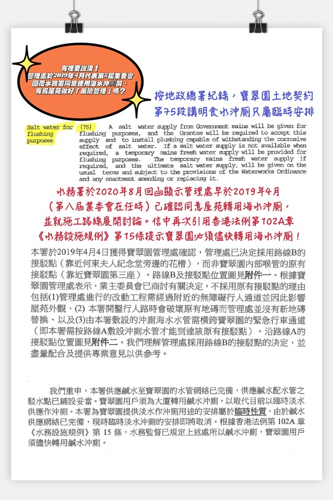 - 寶翠園地契第75段已清楚說明使用食水沖厠只屬臨時安排。自從水務署將海水供水管鋪設到薄扶林道何東夫人堂對出出水點之後,當局就一直引用《水務設施規例》第15條,出信要求本苑居民儘快轉用海水沖厠,否則就係違例。據知水務署自2016年開始已嘗試透過管理處接觸當時嘅業委會,管理處亦不時同水務署商討轉換方案。張小姐咁啱係第七及第八屆委員,有冇可能會毫不知情呢?