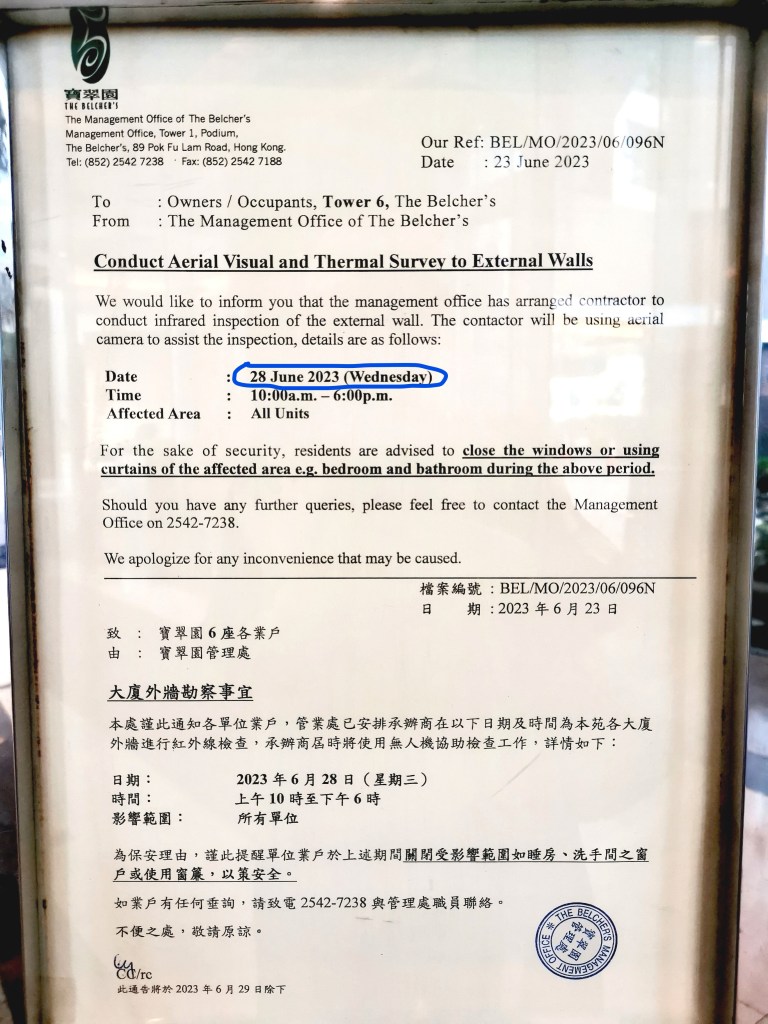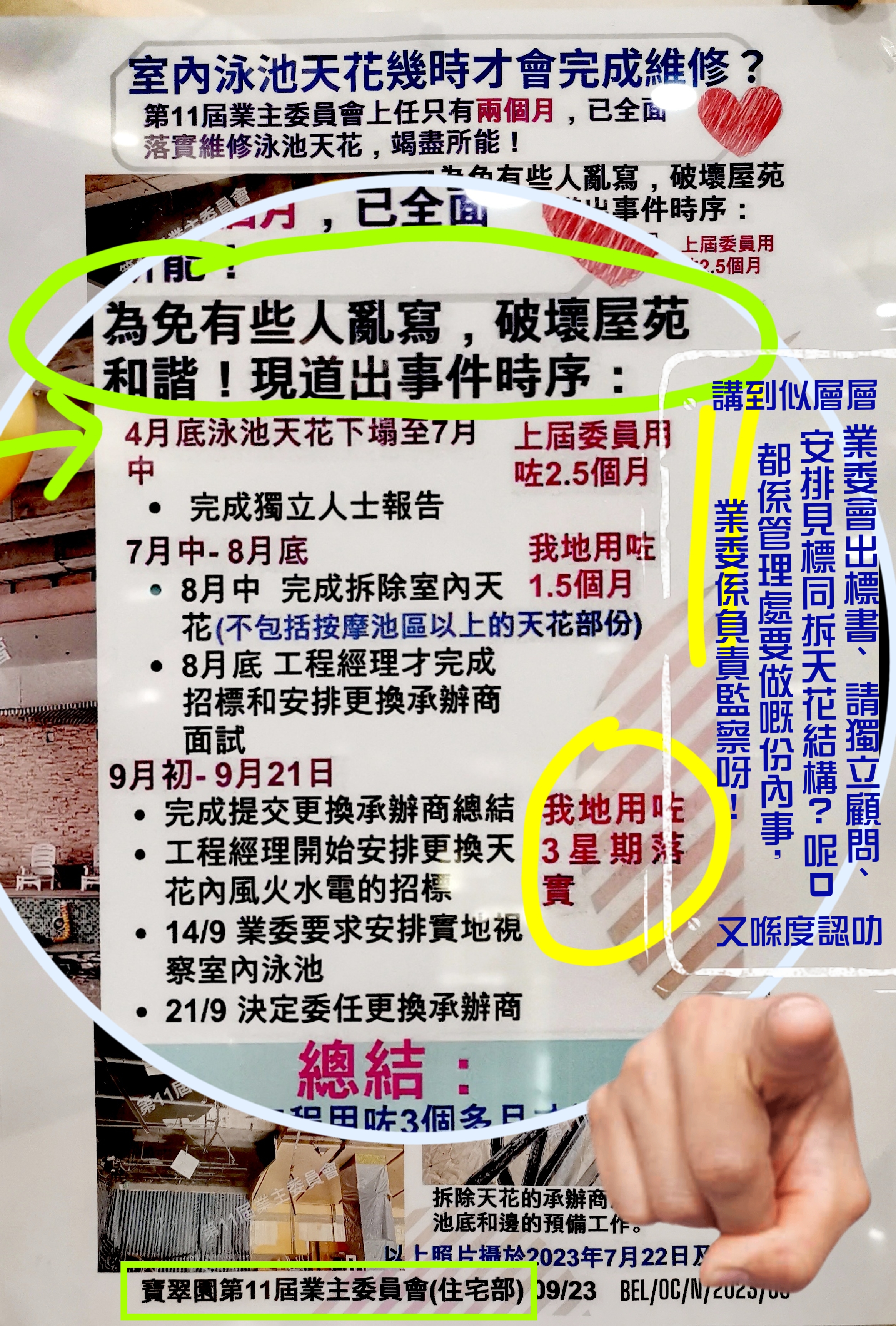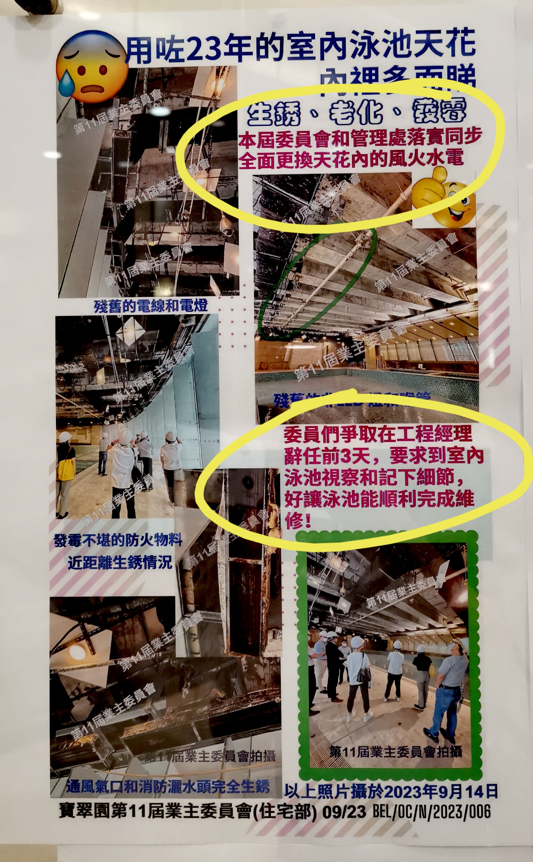 管理處作為持牌物業管理公司喺大堂張貼海報前有絕對責任檢視內容,確保資訊正確及不涉及詆譭或誹謗成分,點解明知海報嚴重失實仲刻意容許曝光及長期張貼誤導業戶居民?室內泳池天花下塌左咁耐,除左會所經理出過幾張通告預告泳池幾時重開之外,點解管理處唔公開勘察報告內容,圖文並茂向所有業戶闡述最新進度狀況?一個涉及數百萬嘅維修翻新工程,連招標文件都冇張貼大堂,係咪用大廈基金支付都冇住戶知?管理處係咪只向業委會15位委員負責就得,其他住戶就只有準時比管理費嘅義務而冇知情嘅權利?完全不可接受!