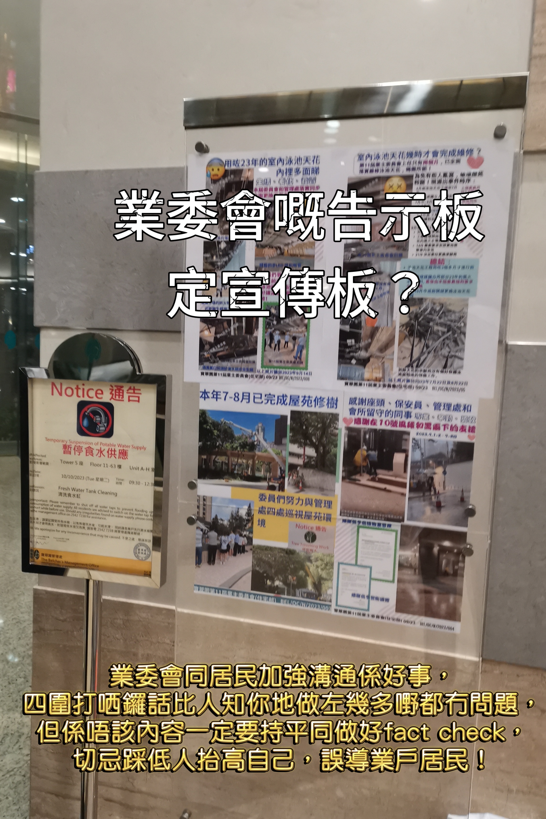 第11屆業委會(住宅部)自從7月中上任以嚟都非常熱衷利用大堂當眼嘅告示板自說自話張貼一D圖文並茂嘅海報,帶出一D似是疑非嘅訊息企圖向住戶鄰居灌輸第10屆嘅委員冇做嘢要等佢地今屆上任先至將D改善工程落實。