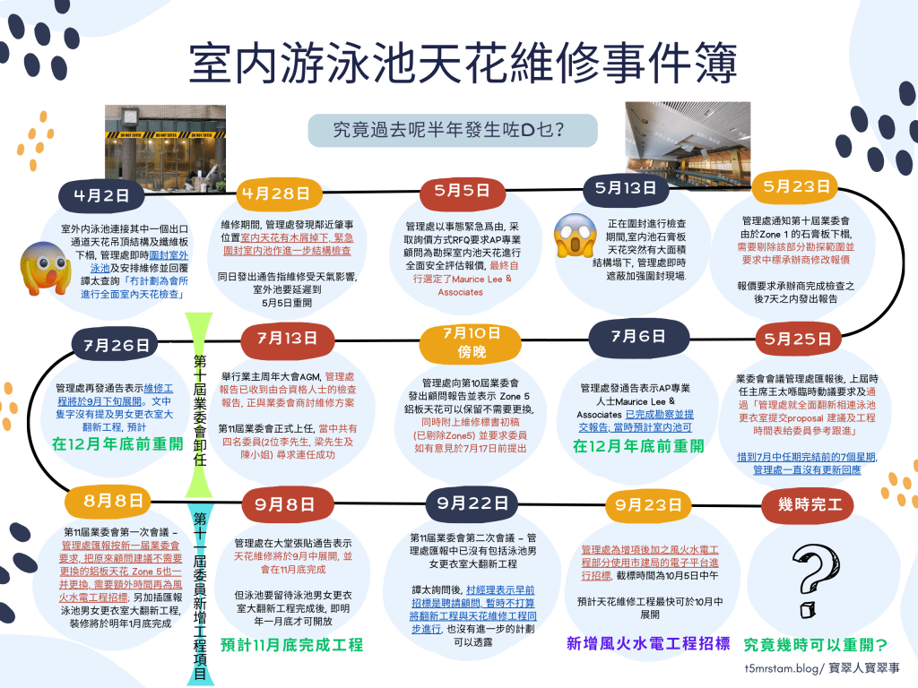 講返今次室內泳池天花倒塌事件,住戶其實都係好簡單想知個泳池幾時重開,趕唔趕得切喺天氣轉冷,室外池要閂之前開返室內池啫。新一屆業委話上一屆唔做嘢又做得慢;佢地呢一屆業委先至做到嘢。似層層講到好似業委會要做埋管理處嗰份要負責寫標書、請顧問、拆走假天花、做埋工程咁!如果真係咁我地仲使乜出糧比管理處上下咁多個職員?每年又使乜額外無情情比多$400幾萬經理人酬金比管理公司「管理」呢個屋苑呢?