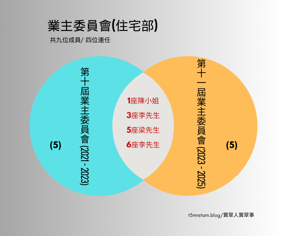 今屆業委會(住宅部)9席之中有4席係成功連任委員,包括一座陳小姐,三座及六座兩位李生及五座梁生(圖三)。既然大堂宣傳告示板內容係以第11屆業委會(住宅部)名義發出,咁即係話呢4位連任委員同意海報內容,對於自己被批評喺第10屆嘅時候浪費左時間冇做嘢、做得唔夠好又唔夠快呢個主觀描述完全冇異議?對於張小姐會上批評上一屆嘅委員唔夠團結又有冇反省?真係大惑不解!