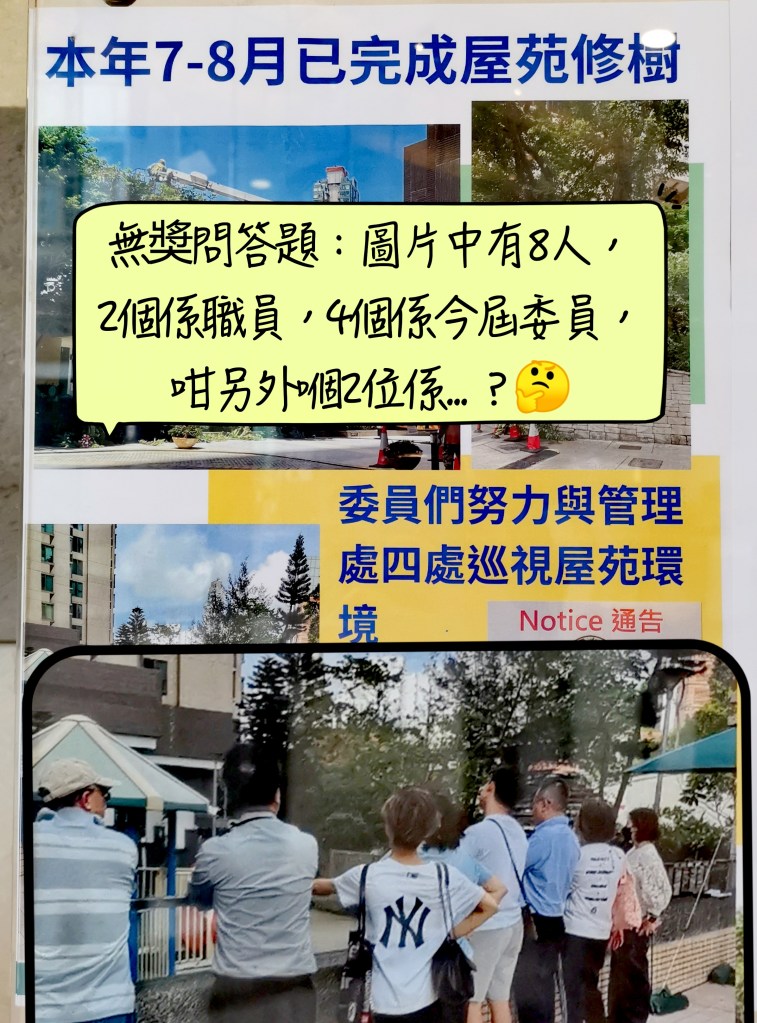 其實業委會同居民加強溝通本來係好事, 新一屆委員中亦不乏資深老手,想喺短時間內爭取好表現嘅心情係可以理解,四圍打曬鑼話畀人知你哋做咗幾多嘢都冇問題, 但係唔該內容一定要持平同做好fact check,吓吓將「要將過去嗰四年(兩屆)失去嘅時間追返」掛喺咀邊,講到以往兩屆嘅委員一無是處兼破壞和諧,只有過去嘅第七第八屆先至做到嘢咁,持續以指鹿為馬踩低人抬高自己嘅手法爭取表現誤導業戶居民。作為業主代表有呢D行為表現,業主居民又點可以指望佢地爭取權益呢?!