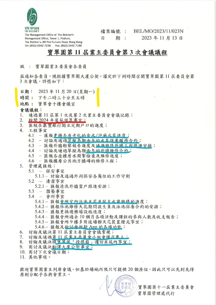 業委會第三次會議黎緊星期一(20/11)下晝2點半舉行。最大支出兩年嘅保安同清潔合約已經喺10月加哂人工,2023年預測有冇做到收支平衡? 2024年度預算案駛唔駛加管理費?抑或要削減民生經常性服務開支好似清抹外窗同維修先至搞得掂?