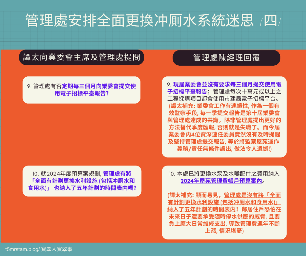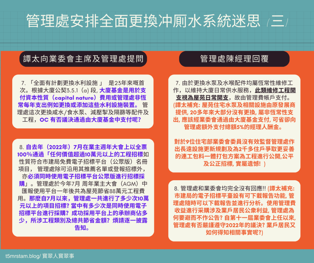 現將相關提問及回覆原文撮要記錄如下,為了有效維護業主權益及深入瞭解業委會立場,譚太仍是希望早日得到主席張小姐及8位住宅部委員的正面回覆。