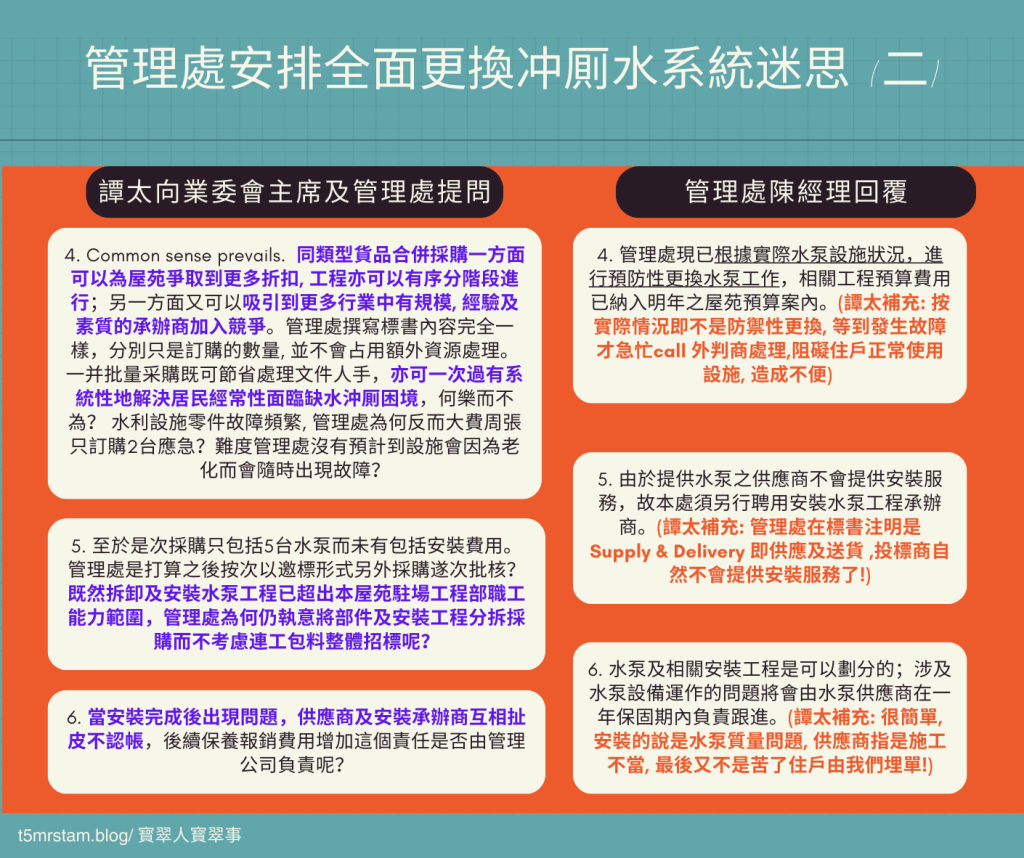 根據大廈公契5.1.2 闡述,業委會成立其中一個目的是代表2000多個業主住户與管理處商討屋苑管理事項。譚太9月22日列席業委會第二次會議並得知業委會通過管理處採購價值超過10萬元的咸水泵,並打算將安裝工程分開採購。有感做法奇特兼且容易引人誤會有拆單之嫌疑,遂於會議後在居民通訊群組向資深業委會委員陳小姐作出以下提問:
