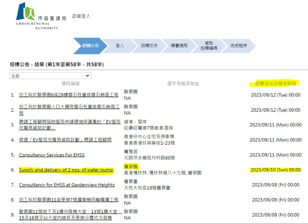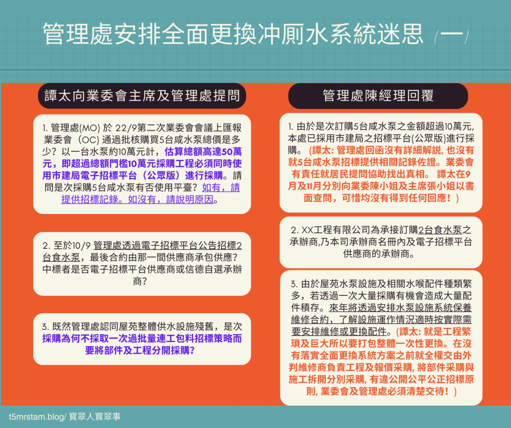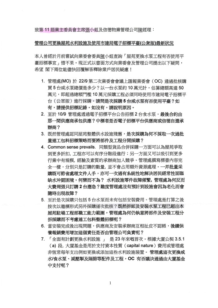 「一台泵幾萬蚊,5台一齊換一定過10萬,請問業委會投票嗰5台咸水泵,有冇經過電子招標平台招標呢?(我網上只可睇 snapshot,OC可以睇到 report 會清楚D)另外10/9呢2台食水泵(water pump)應該已經截標,MO點解唔一次過訂多D呢?👇🏼」