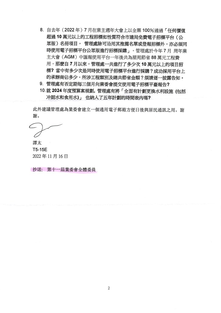 很可惜等了將近兩個月陳小姐在群組之中並未有回應。為免強人所難,譚太遂於11月16日同步以電郵及信件形式向管理處及業委會主席張小姐提問,並於前天12月1日收到管理處回覆。唯至截稿前,譚太仍然未收到主席任何表態回覆,深感無奈。