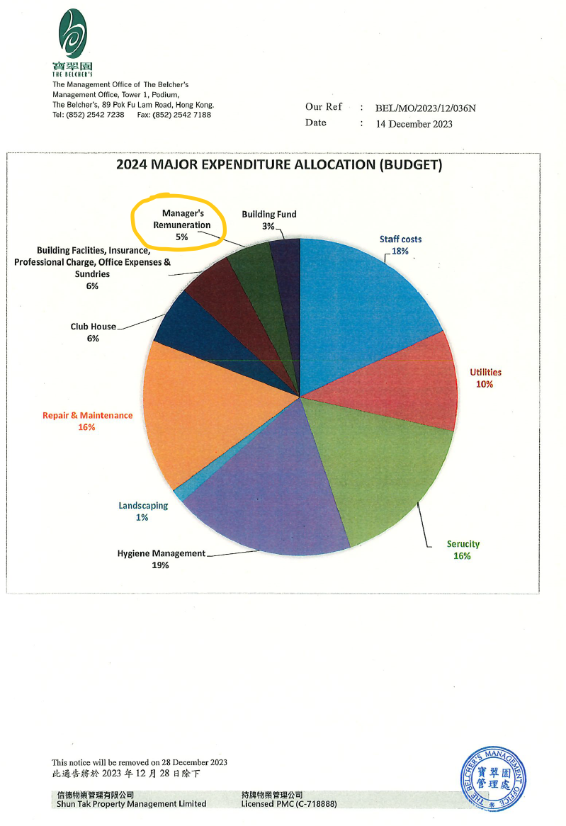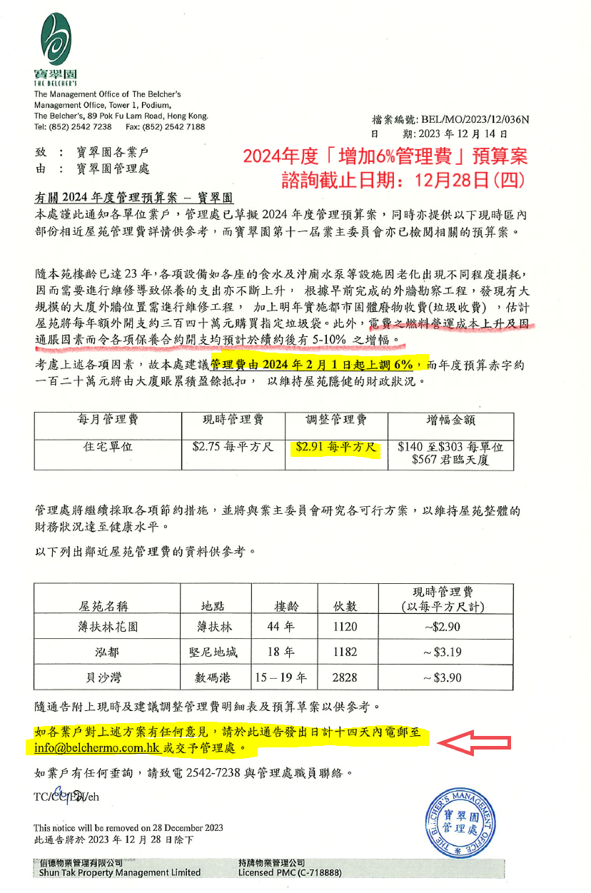而事隔3個多星期,經過第九屆前委員Ringo公開追問,這個增加6%管理費的赤字預算案終於喺今日出台。而管理處隨即按大廈公契3.4.1 b (iii) 段規定展開為期14天的業戶諮詢,並於12月28日結束。大家可以從住戶專用 Mobile APP下載,把握時間將自己的意見向管理處一一反映,不要錯過。
