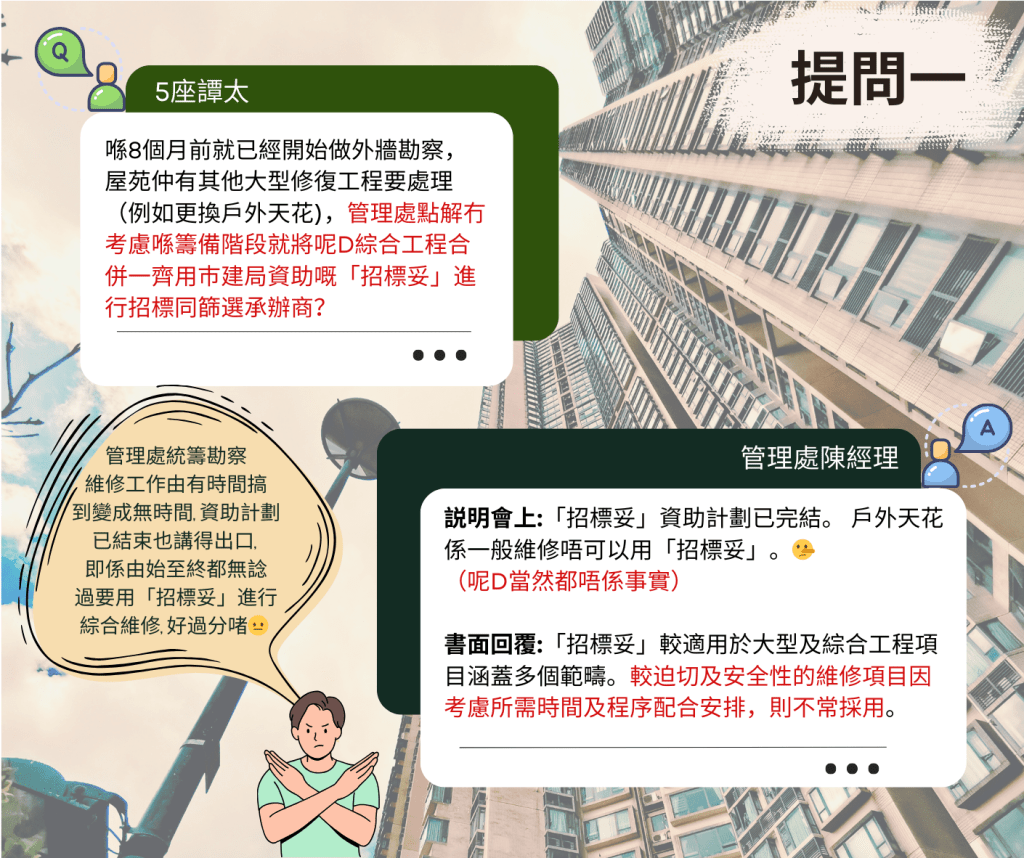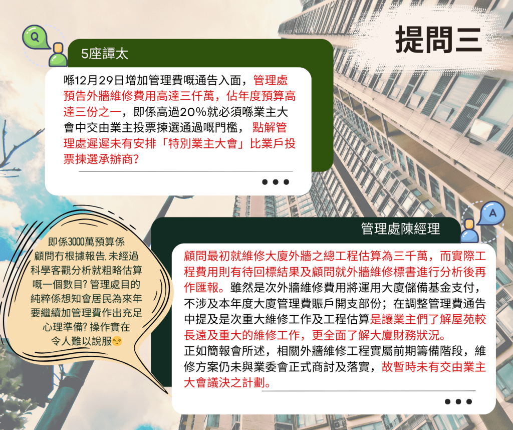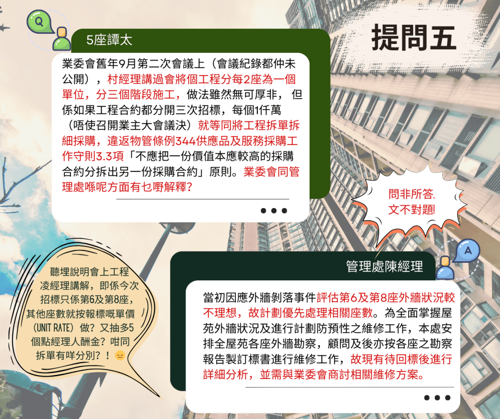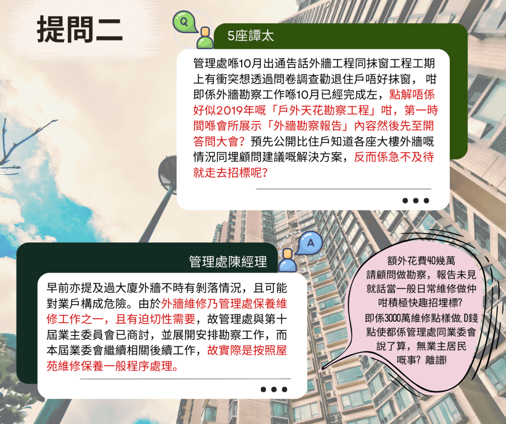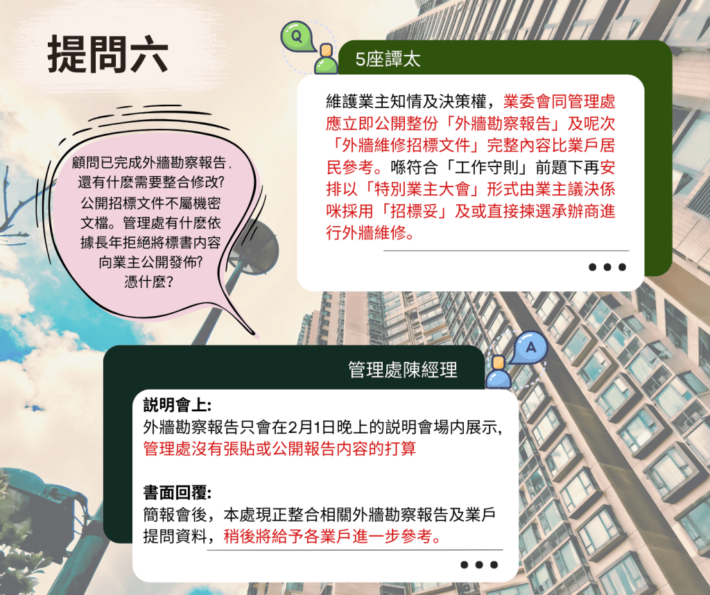 自2月1日管理處舉行外牆維修說明會又已經匆匆過了廿多天的時間,譚太於2月14日終於收到陳經理就6大提問的電郵回覆。資料經整理後現與各業主住户分享,雖然未必能夠完全解開大家心中疑團,至少也可以從經理回覆中的字裡行間,對管理處及業委會在外牆大維修所持的態度及立場,希望幫助鄰居們對整個事件有更深一層瞭解。