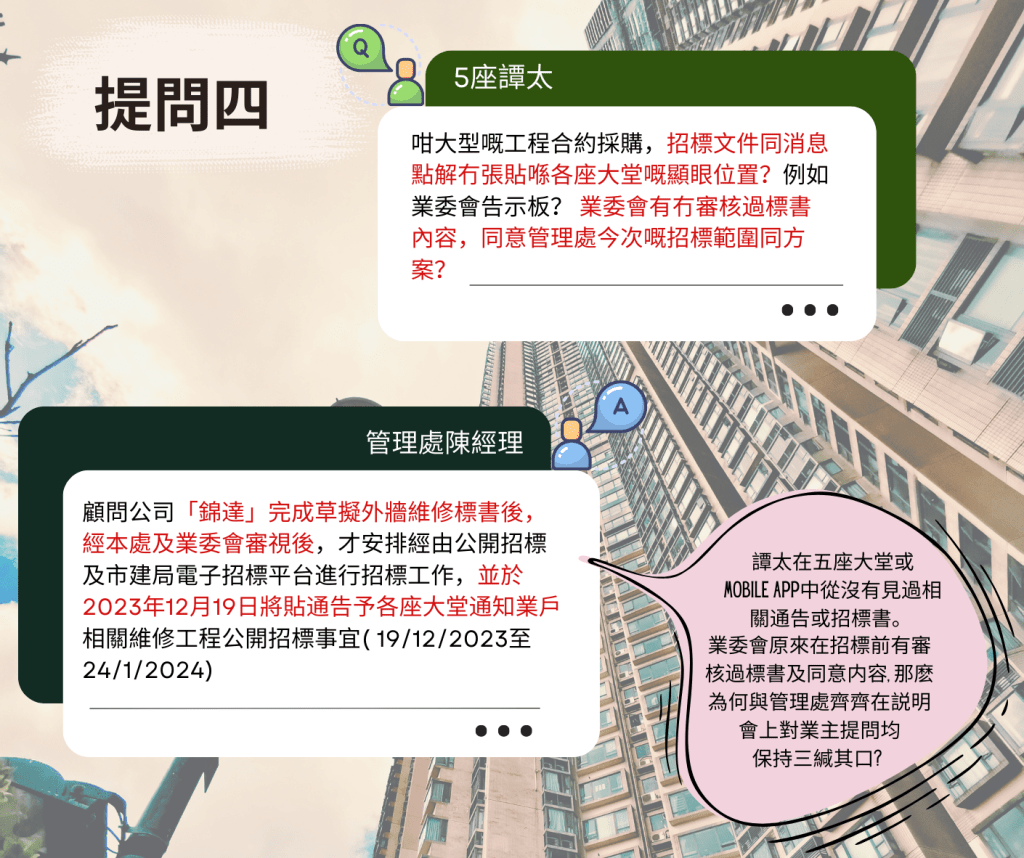 另外據知除譚太外亦有其他業主也同樣聯絡上管理處要求早日公開勘察報告,招標書及招標結果但不果。在此譚太呼籲業委會能夠納諫如流,儘早成立「工程及維修工作小組」,好讓其他有相關工程及項目管理經驗業主加入討論,以協助他們將一件本來是好事正確地處理,還業户居民一個安全居住環境。